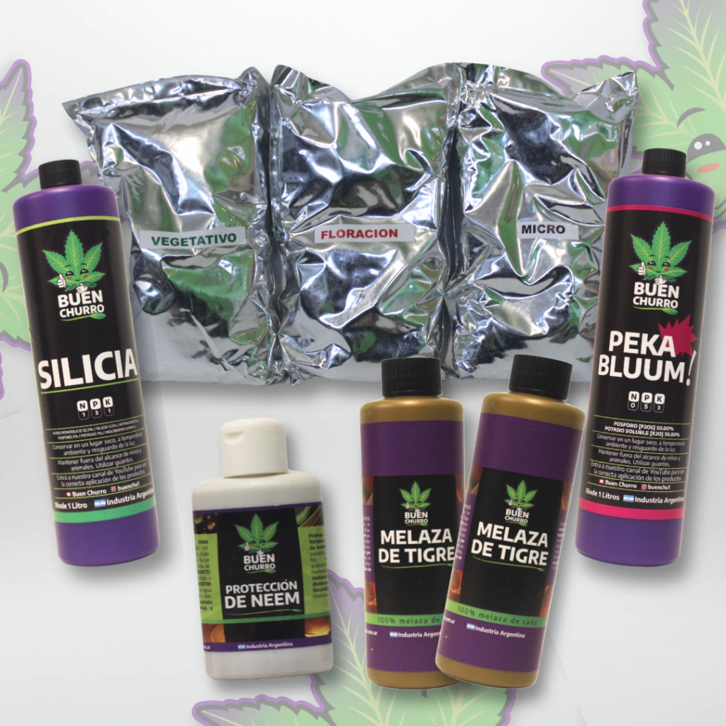 - ¿Qué trae? COMBO SALES BUENCHU (VEG, FLOW, MICRO) 1KG SOLIDO (Vale para 4L)// MELAZA de tigre 2 por 500ml// Proteccion de NEEM 50ml// Silicia 1L// PK bluuum 1L